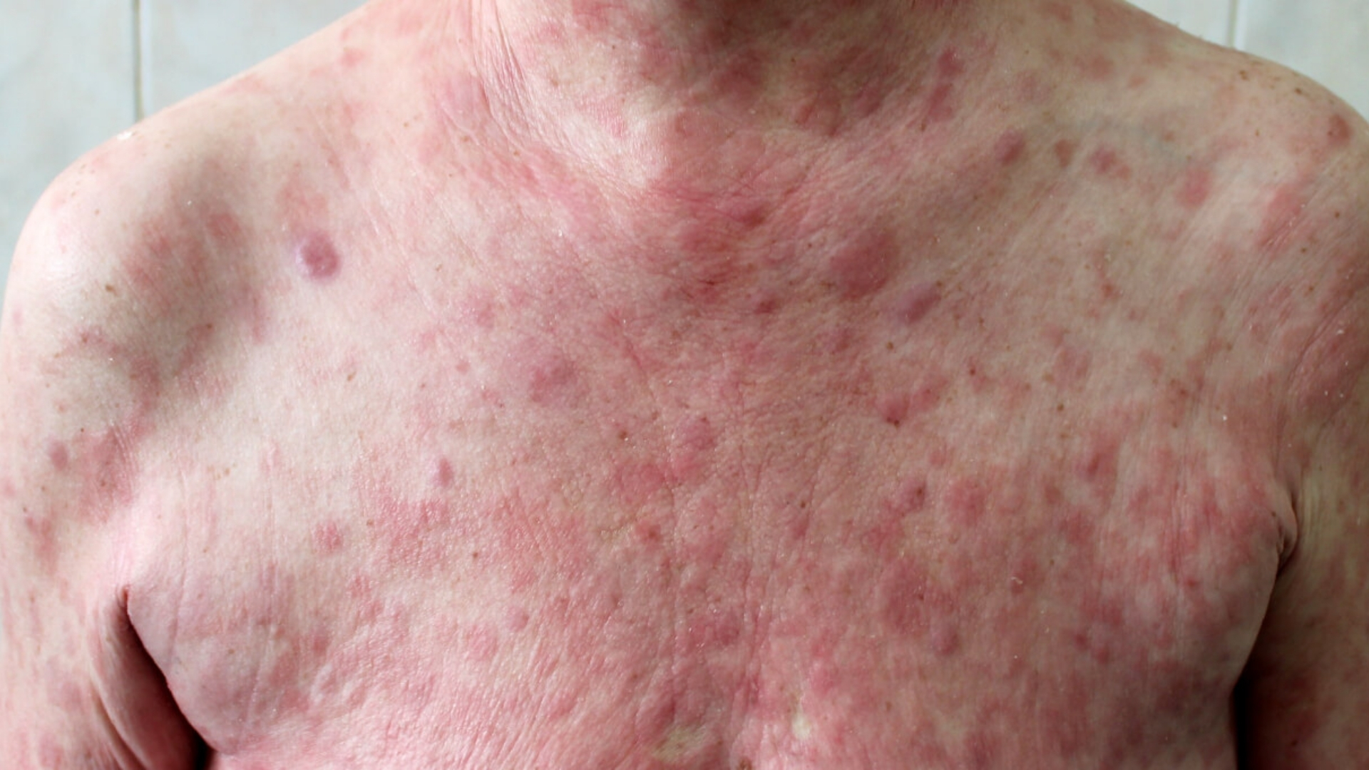 - 成片的鱗屑、痕癢、紅色皮膚,類似濕疹或牛皮癬。
