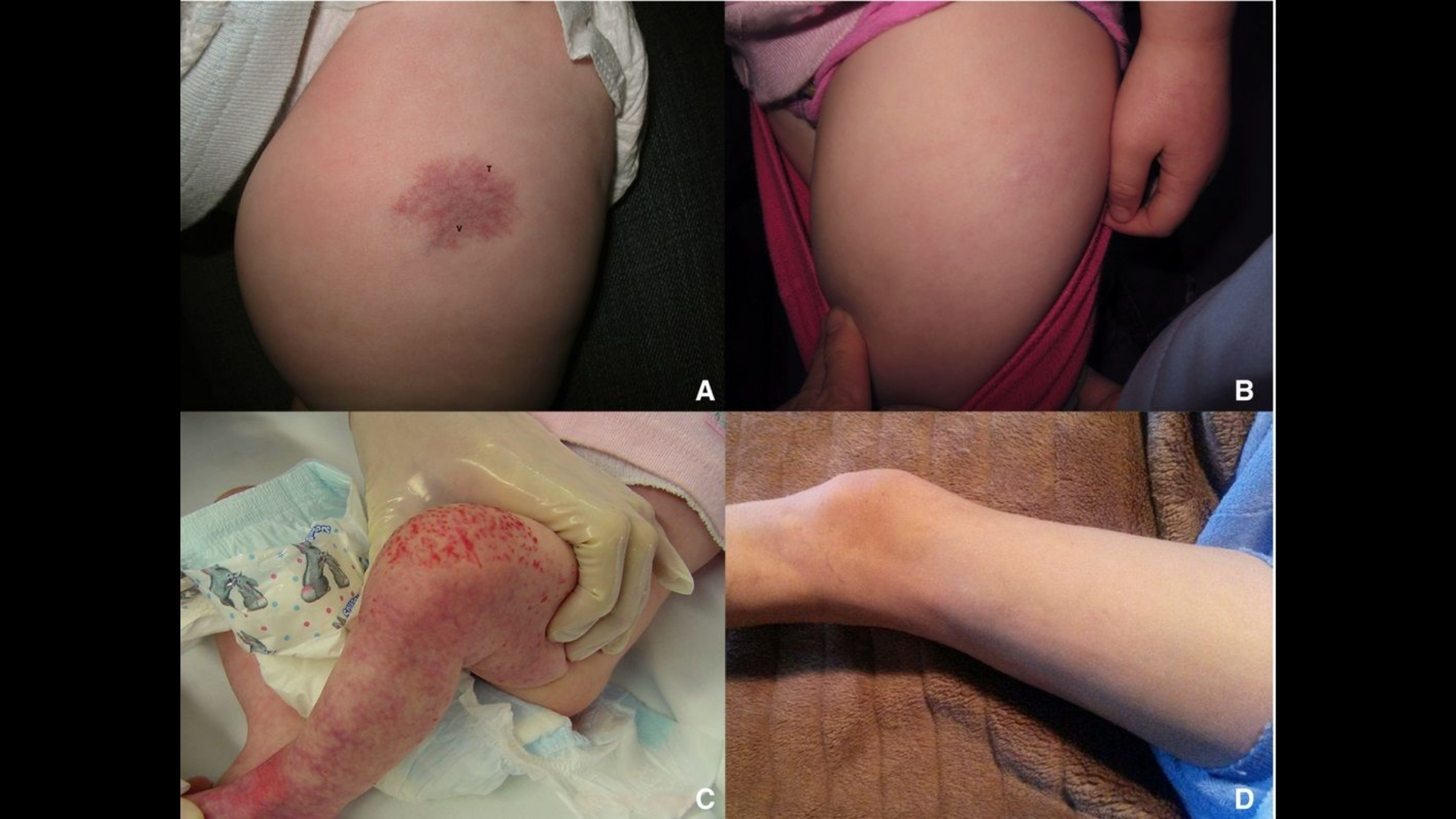 • 迅速出現皮膚褪色 - 紅色、紫色或藍色病變。