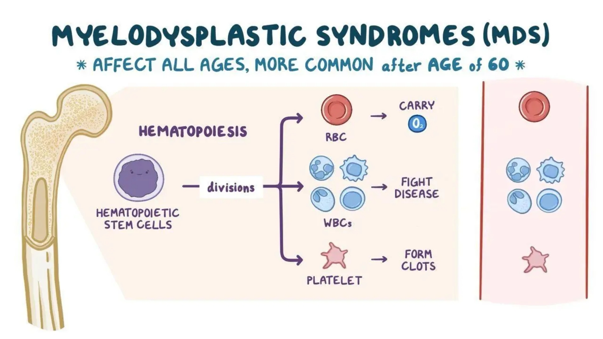 瞭解骨髓增生異常綜合症 (MDS) 首先要瞭解其生物基礎。MDS 涉及造血幹細胞不受控制的增殖、分化障礙及凋亡增加。健康的造血過程中,血細胞會正常成熟,但受 MDS 影響的細胞卻無法正常成熟,往往停留在未成熟階段,並喪失其功能。因此,患者通常會經歷慢性貧血,並且更容易受到感染和出血發作。